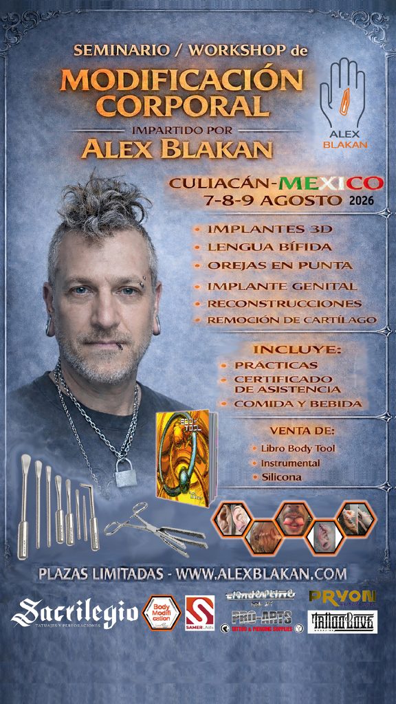 Durante los días 7 a 9 de agosto 2026 estaré explicando en Culiacán-Mexico con algunas de las modificaciones corporales más extremas: implantes genitales, remoción de cartílago, lengua